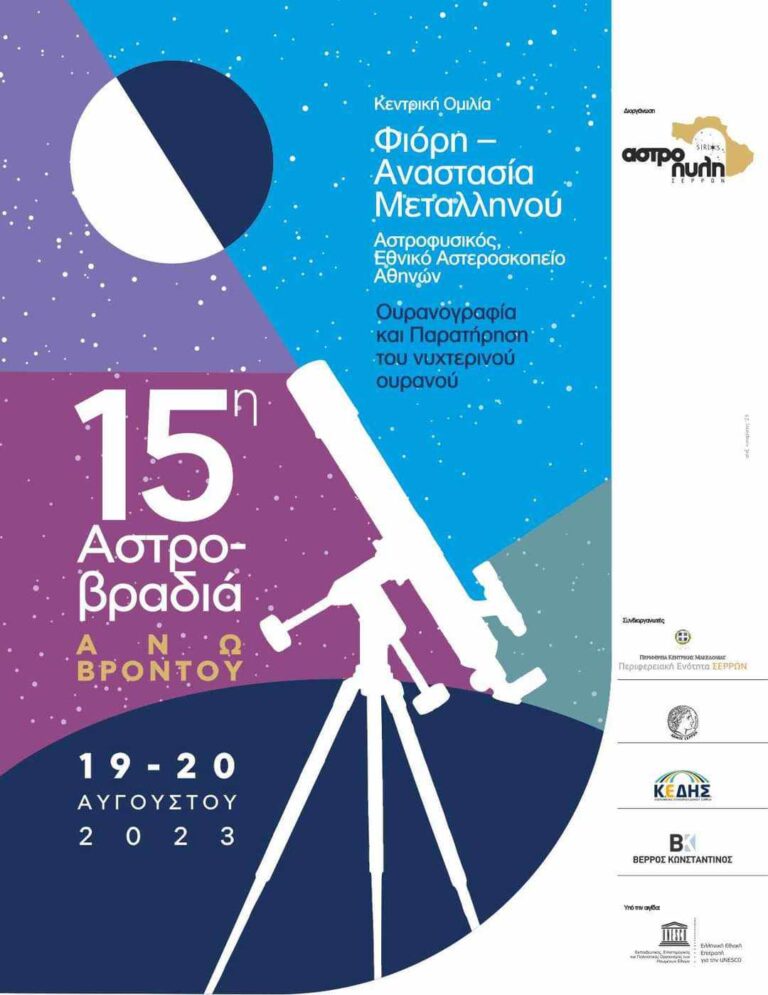 Στις 19 και 20 Αυγούστου 2023 θα πραγματοποιηθεί η 15η Αστροβραδιά στην Άνω Βροντού με τη συνδιοργάνωση της Κοινωφελούς Επιχείρησης του Δήμου Σερρών (Κ.Ε.ΔΗ.Σ.).