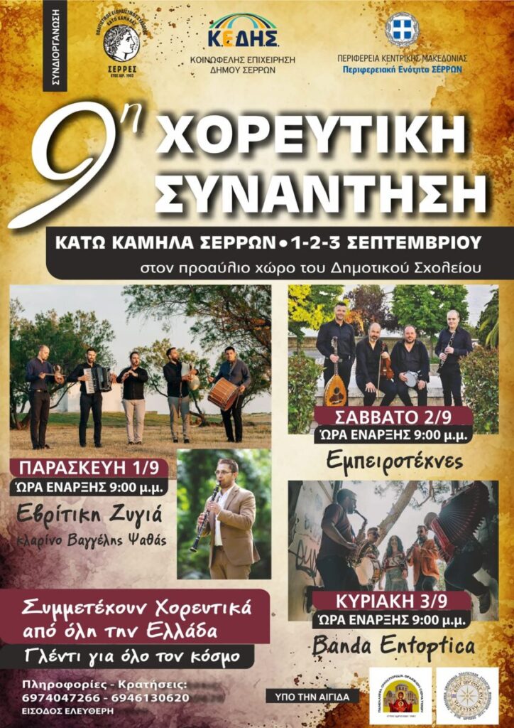 Τριήμερες πολιτιστικές εκδηλώσεις θα πραγματοποιηθούν στον αύλειο χώρο του Δημοτικού Σχολείου Κάτω Καμήλας την Παρασκευή 1 και το Σαββατοκύριακο 2 και 3 Σεπτεμβρίου 2023, τις οποίες συνδιοργανώνουν ο Πολιτιστικός Εξωραϊστικός Σύλλογος Κάτω Καμήλας, η Κοινωφελής Επιχείρηση του Δήμου Σερρών (Κ.Ε.ΔΗ.Σ.) και η Περιφερειακή Ενότητα Σερρών, στο πλαίσιο της 9ης Χορευτικής Συνάντησης.